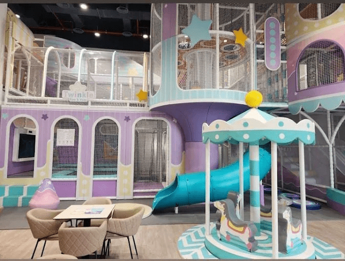 Yes! Safety and hygiene come first at Twinkle Fun & Yum. The soft play zone is fully padded flooring with safety mats, sanitized after every session, and monitored by trained play coaches.