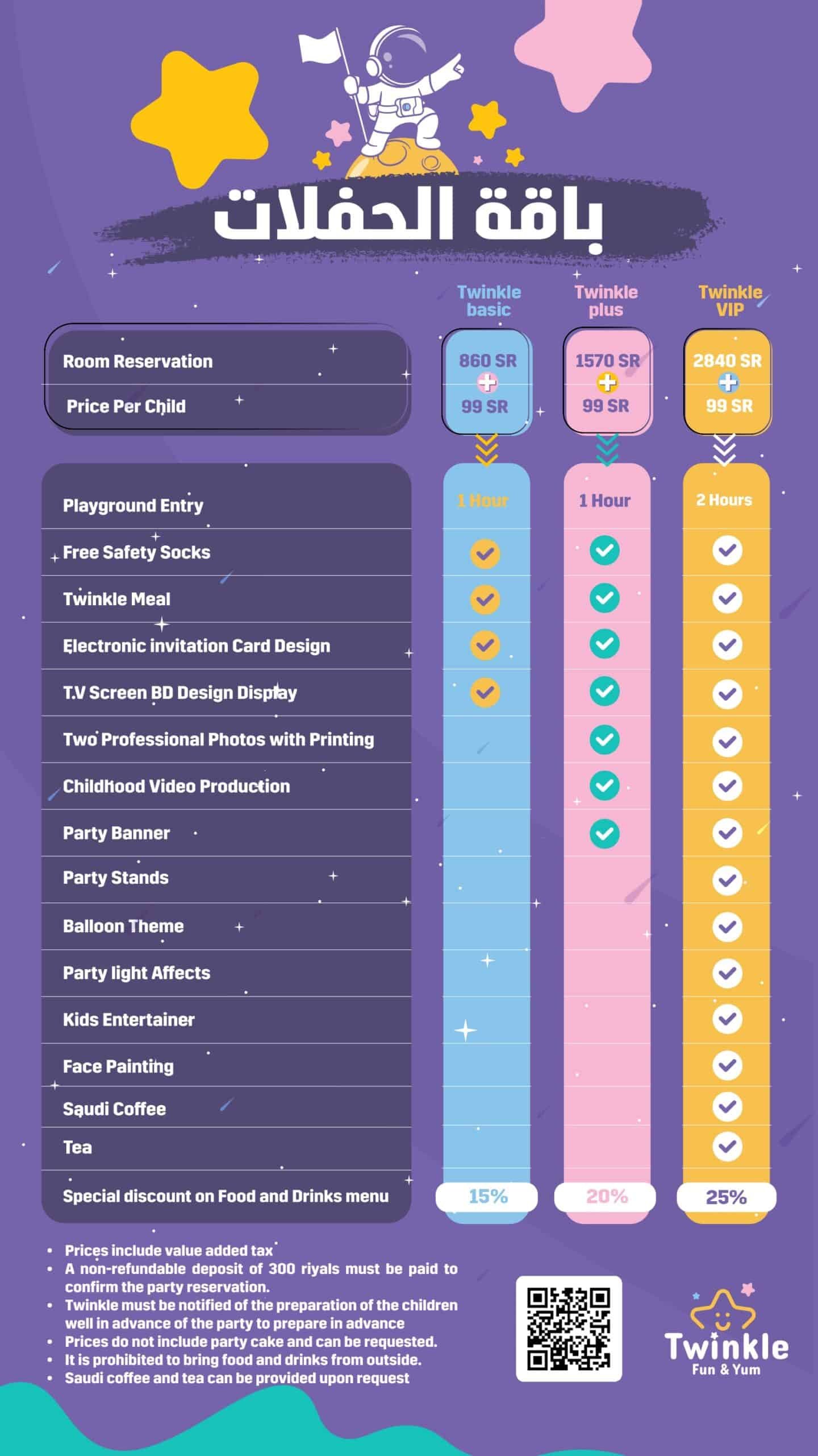 At Twinkle Fun & Yum, we offer a unique experience that combines fun children’s games with a safe and welcoming environment for all ages. We’re more than just a play area in Dhahran – we’re a complete family destination that blends a kids’ café with exciting indoor play zones. Families from Dammam, Khobar, and Dhahran can enjoy quality time together in a relaxed and secure setting, where kids explore interactive activities and themed parties while parents unwind at our children’s play café. Choose Twinkle Fun & Yum as your favorite spot for joyful play and laughter in the Eastern Province.